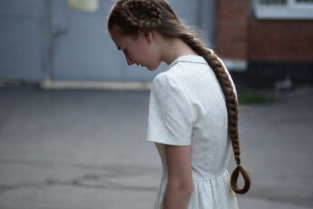 Вся улица залита солнечным светом. Надя стоит в легком