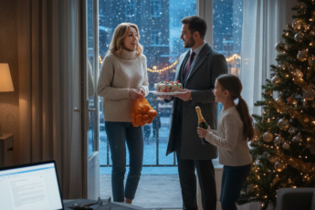 И вот они уже стоят с бокалами в руках за столом, на диванчике сидят Шарик с Рыжиком, а до Нового года остаются считаные секунды. Четыре, три, две, одна…