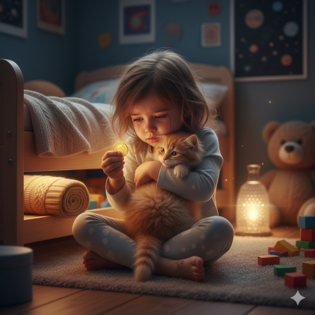 — Папа, а монетка оказалась и вправду волшебная! У меня есть кот, а счастье мне нагадал Гоша попугай. А мама родила мальчика, — девочка шептала папе все новости сразу…