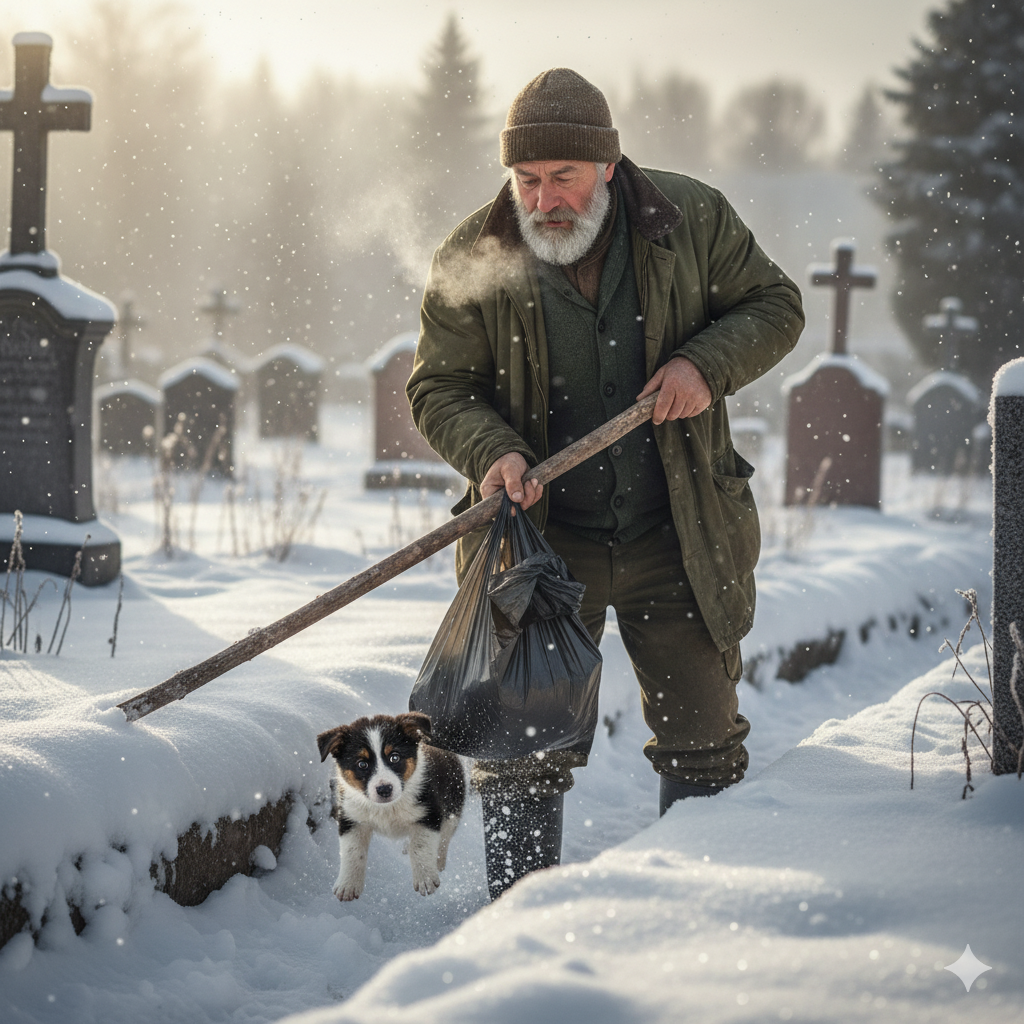 Щенок вздрогнул (то ли от страха, то ли от холода) посмотрел в сторону кладбища. потом — на сторожа. Он совершенно не знал, что ему делать.