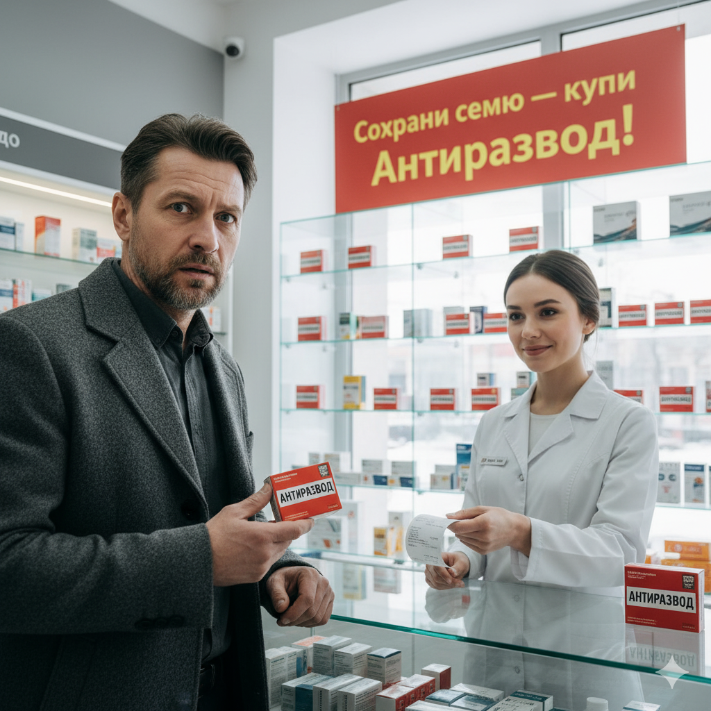 — «Средство «Антиразвод». Применять не меньше трёх раз в день…» — Он прочитал это странное название препарата, и с недоумением посмотрел на молодую девушку фармацевта. — Это что, вообще, такое? – Степан стал внимательнее разглядывать на стеклянной аптечной витрине маленькую коробочку, пытаясь вычитать на ней ещё какие-нибудь подробности.