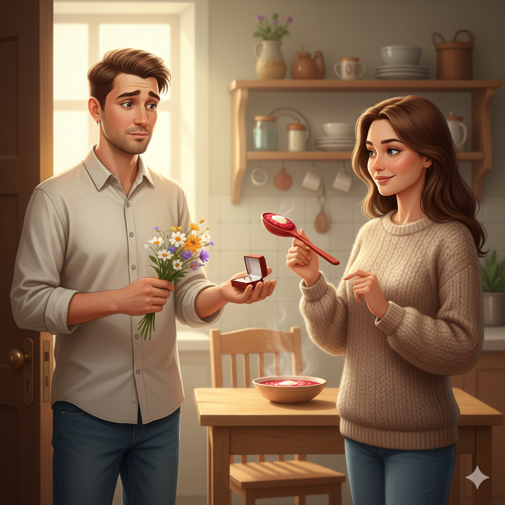 Мужчина сглотнул слюну и, бросив последний взгляд на тарелку с вожделенным варевом, вышел. И, конечно же, прихватил кольцо и букет: не оставлять же!