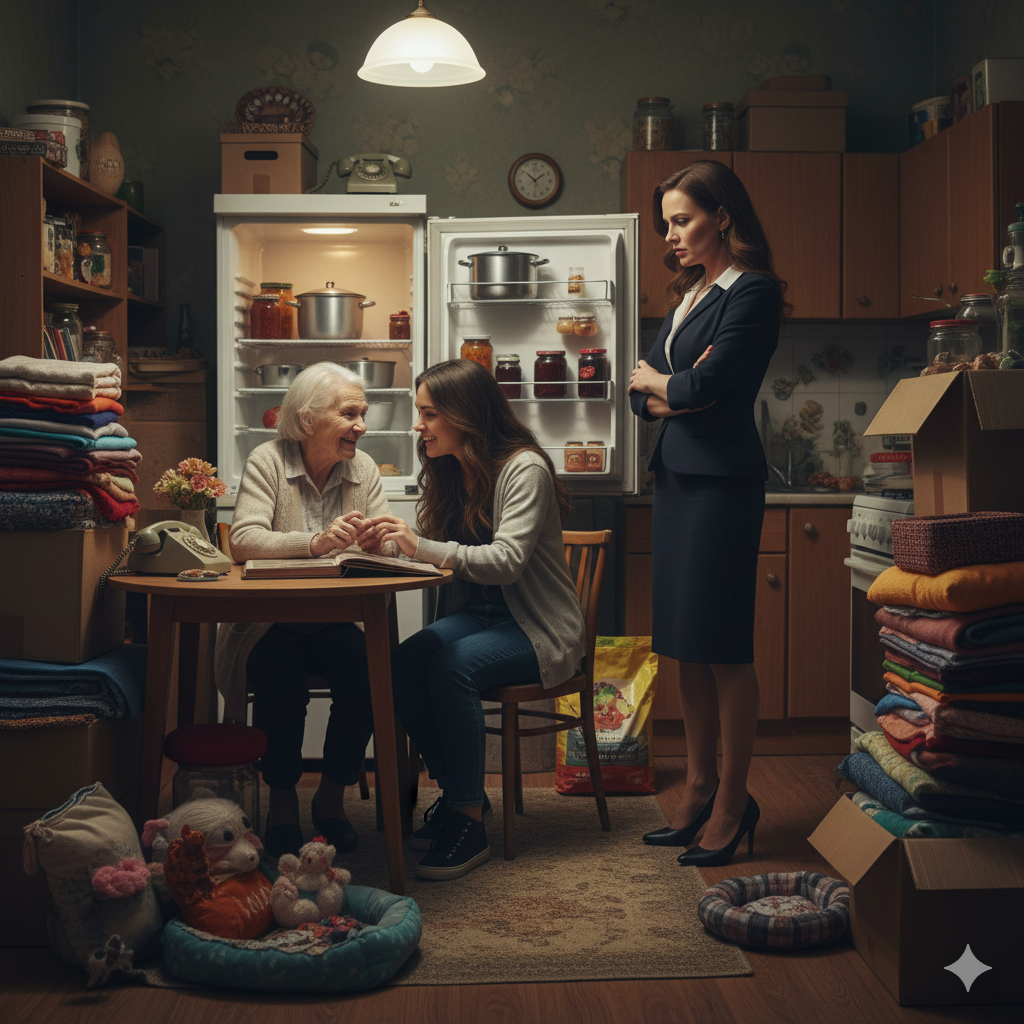 Приехали к дому бабушки. Старушка бросилась в объятия внучки и зарыдала. Они не виделись долгих пять лет, с тех пор как погиб папа. Квартира бабушки была и впрямь загруженная, но чистая. Много всяких баночек, коробок и вещей, но все сложено в стопочки. Передвигалась она с трудом, с помощью костылька и по стеночке.