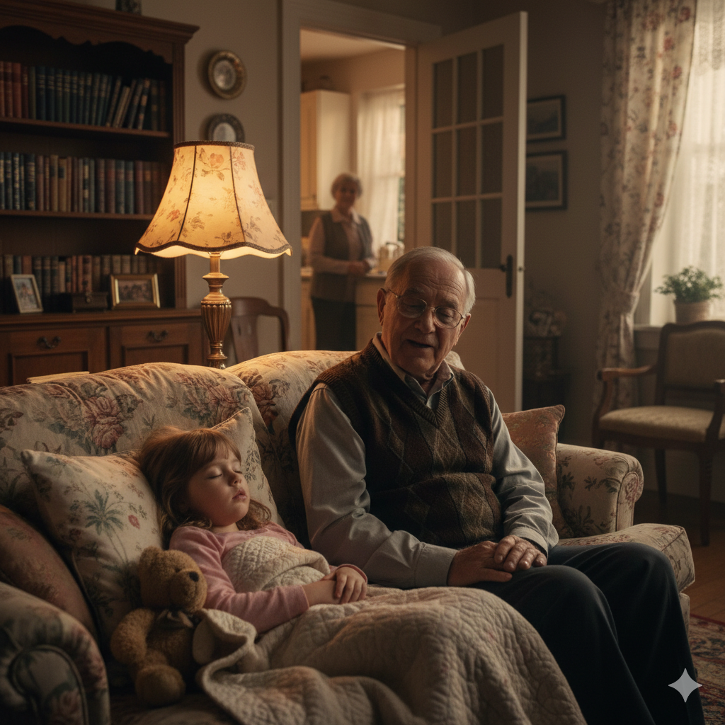 Дедушка подхватил внучку на руки, понёс её в постельку, в другую комнату, укрыл там одеялом, поцеловал в лоб и собрался уже уходить, как вдруг услышал: