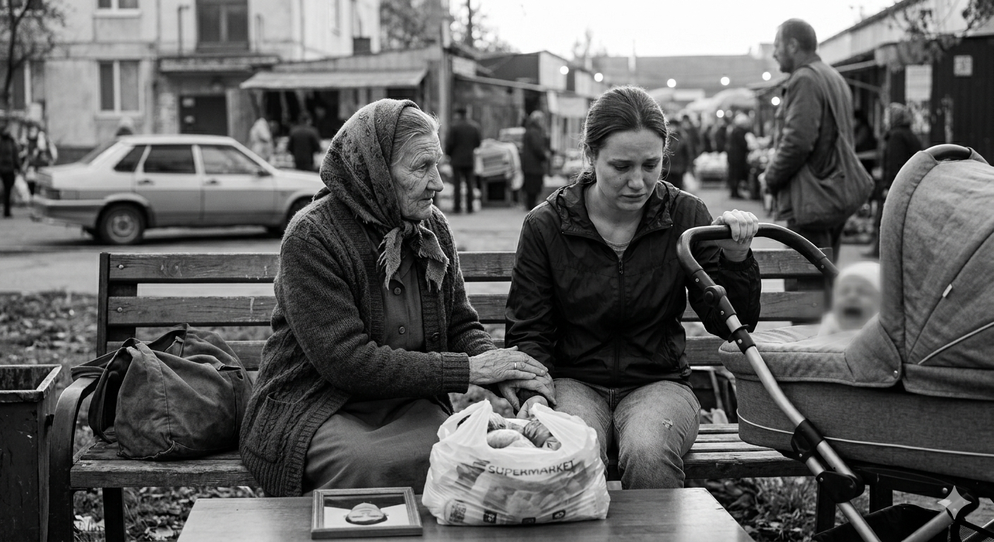 Выйдя из магазина, баба Валя заглянула в пакет, чтобы проверить, всё-ли она купила. Вроде всё. Голова аж закружилась от этого людского мельтешения, толкаются, топчутся, под ноги не смотрят.