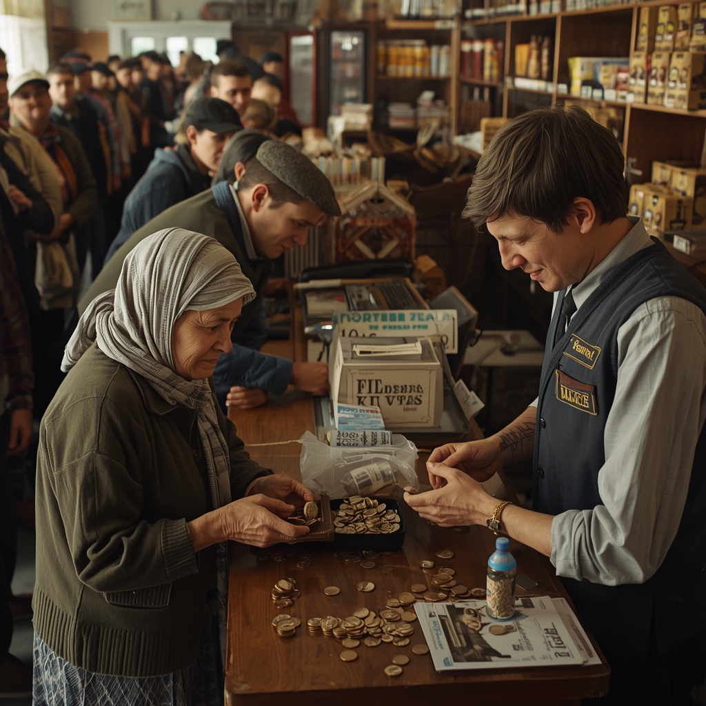 Очередь начала ворчать. Кто-то вздохнул, кто-то пробормотал: «Ну сколько можно?» Бабушка, словно не замечая нарастающего недовольства, продолжала считать, извиняясь тихим голосом: «Сейчас, милок, сейчас… Вот ещё рубль…». Монеты выскальзывали из её пальцев, одна даже закатилась под прилавок. Саша, не говоря ни слова, наклонился, подобрал монету и положил её обратно к остальным.
