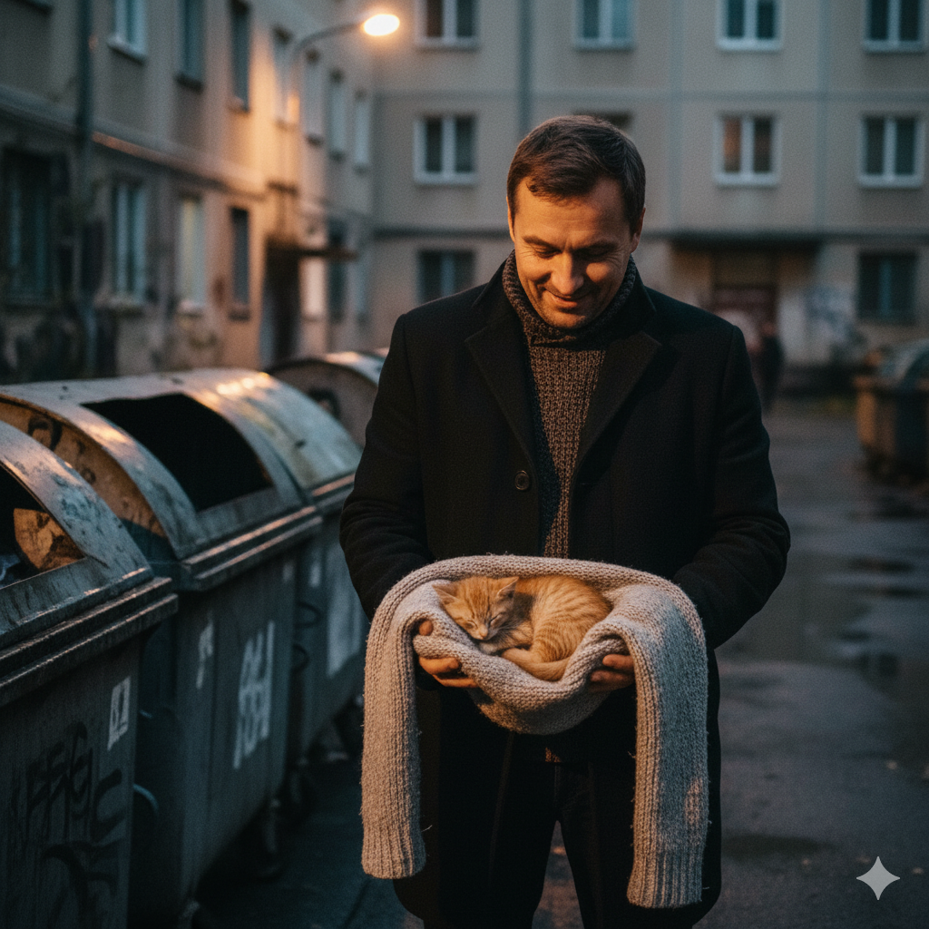 Олег наклонился, чтобы поднять его, и от неожиданности замер, потому что в самый последний момент заметил, что на шерстяном свитере, свернувшись клубочком лежал маленький котенок. На улице холодно было, вот он и нашел себе пристанище.