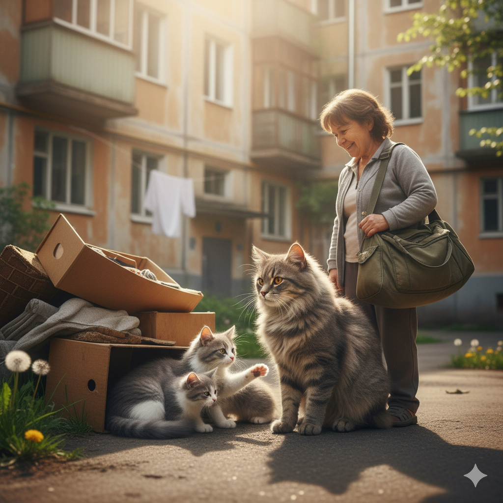Наконец, она увидела их… Маленькая серая кошечка и трое котят, а рядом сидел Бомка с совершенно довольным видом. Женщина почему-то схватилась за сердце…