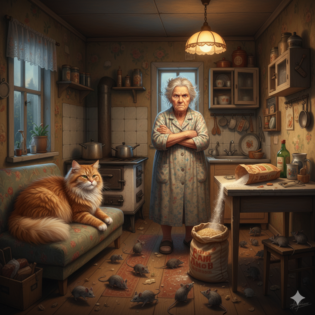 Дни шли, а мыши становились всё наглее. Галина обнаружила, что они добрались до кладовки, оставив там целую дорожку из крошек. Борис же продолжал притворяться декоративным элементом интерьера.