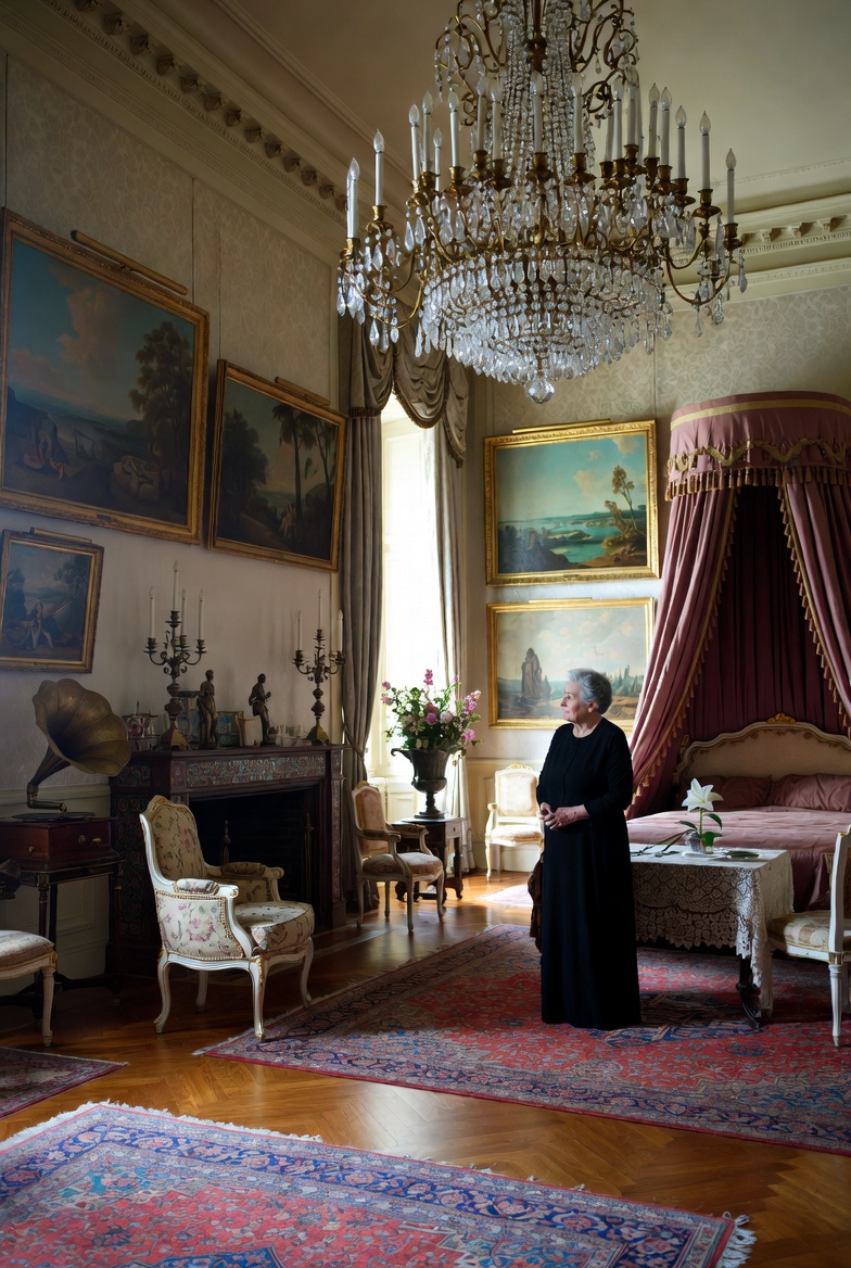 Кровать с высоким подголовником венчал бордовый балдахин. Покрывало лежало безупречно, ни складочки. По углам свисали кисточки из плотных золотых нитей. К изножью примыкала скамеечка на кручёных ножках с бархатным сиденьем.