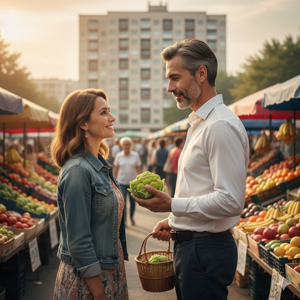 Подняла глаза и увидела знакомую фигуру, оказался сосед. Он спрашивал у продавца, покупая цветную капусту: