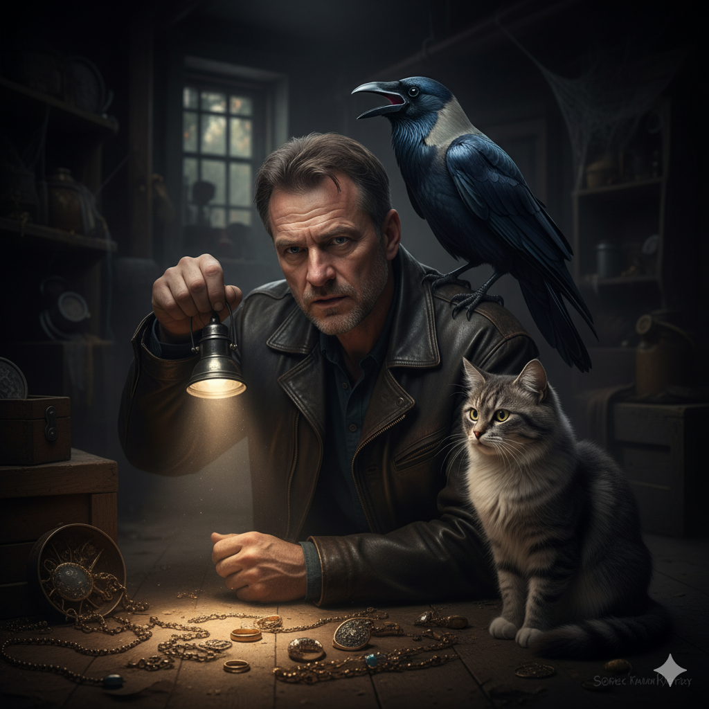 Он прикрыл рот рукой, потому что вскрикнул от изумления. Весь пол был усыпан кольцами и прочими украшениями из старинного сундука, разломанного собакой. Внутри ещё были старинные деньги.