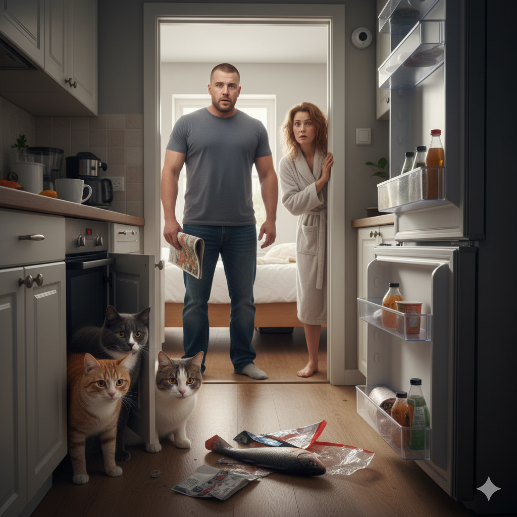 После чего они проследовали на кухню, где все три кошки вернулись к поеданию честно украденной рыбы. Узрев кучу народа, вошедшую в кухню, они вновь, жалобно подвывая, разбежались.