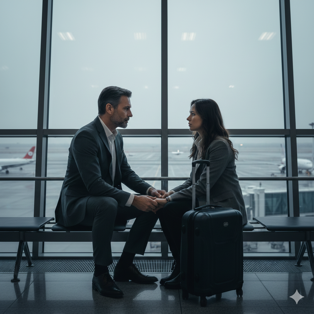 Полный зал пассажиров в столичном аэропорту. У окна, взявшись за руки, сидят отец и дочь. Оба заметно нервничают. Нина летит учиться в США, в самый престижный и дорогой вуз.