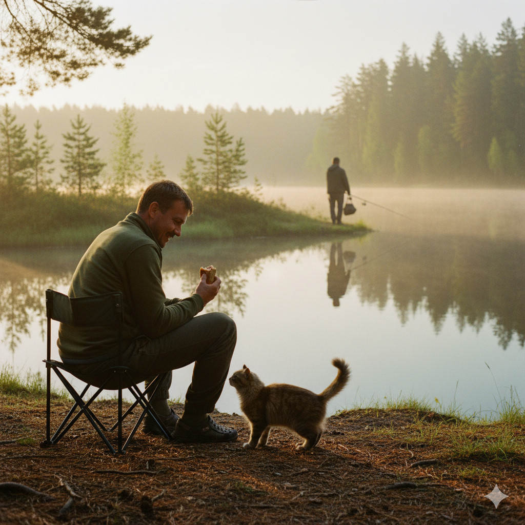Михаил сидел на складном стульчике, изредка посматривая на поплавок, и рассказывал о своей жизни. А кошка пристроилась у него на коленях, тихонько мурлыкала и внимательно его слушала.