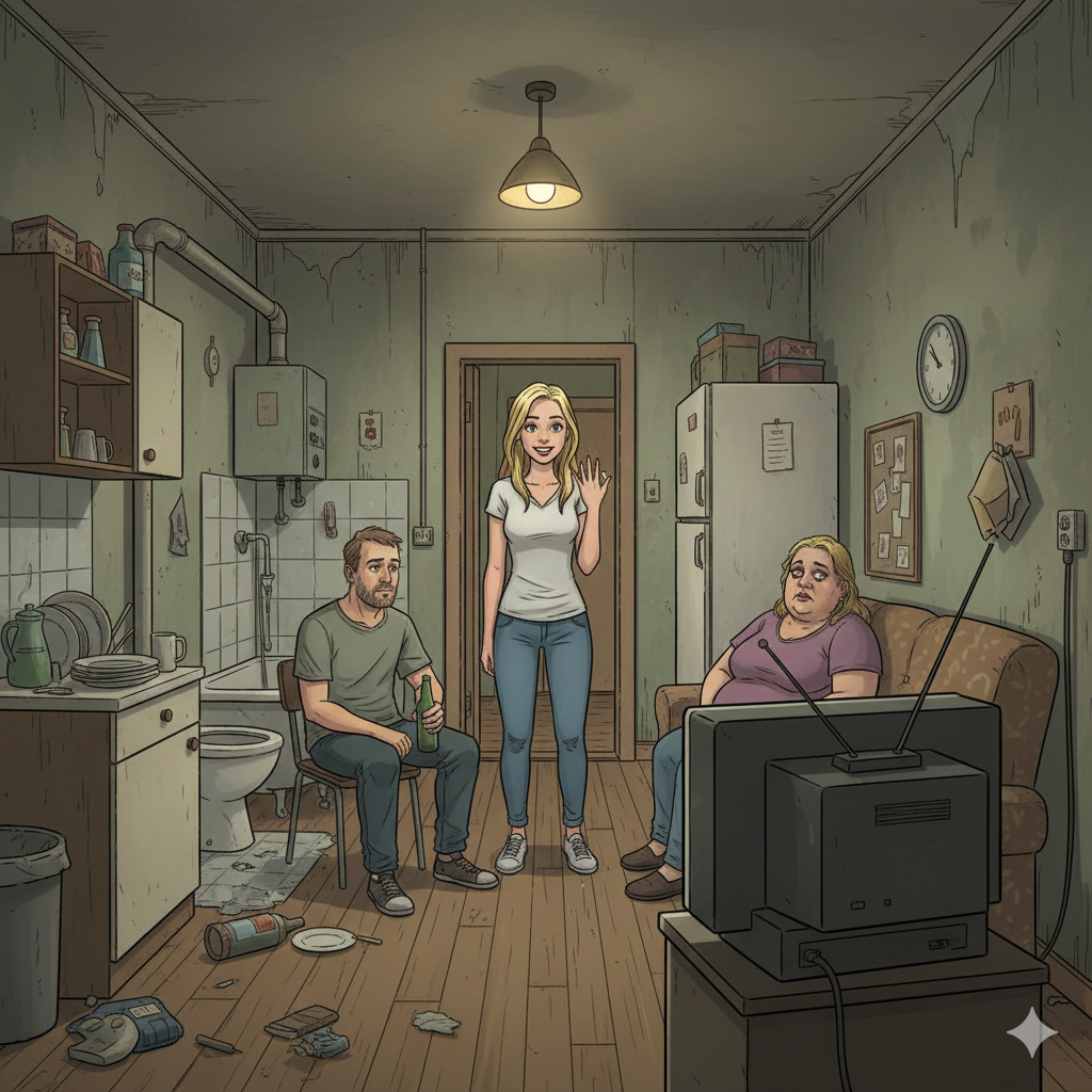 Мать, растолстевшая от обилия сладостей и выпечки, а также беспрерывного сидения у телевизора где-то что-то убирала, получая какие-то копейки. Оба ничего от жизни не хотели, их всё устраивало, точнее, не трогало. Дочка росла, как говорится, бурьян-бурьяном, но не пошла по плохой дорожке, училась, выбивала у родителей гроши на приличную одежду, нормальный, хоть и бэушный телефон, косметику.