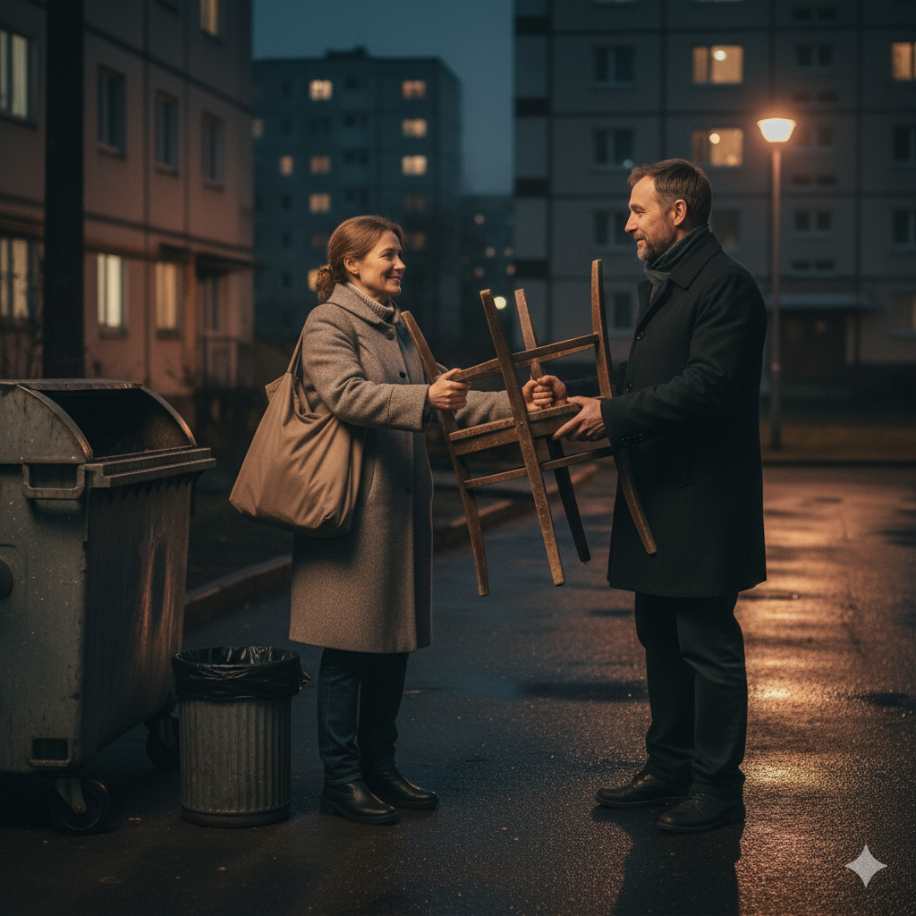 Аня стояла в нерешительности, и не от того, что стул жалко, а от удивления, что вполне приличный человек подбирает мебель у мусорного бака.