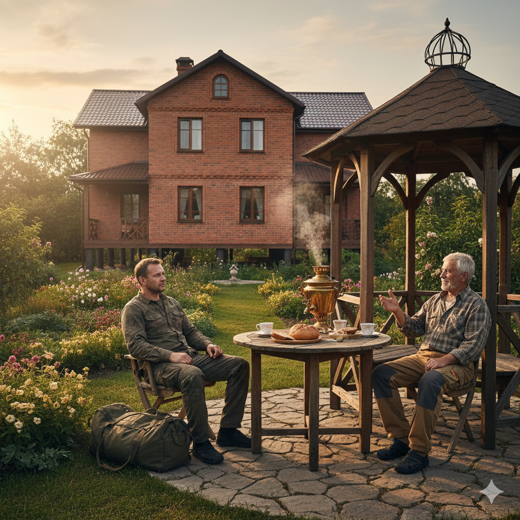 Подъехав к дому Михаила и Лены, поразило Дмитрия их жилье простотой, размахом и тем, сколько вложено труда. Двор окружала ограда из тесаных вручную столбов, увитых хмелем и декоративным виноградом. Просторный дом на сваях из красного кирпича, у ворот скважина, а в дальнем углу двора стояла бревенчатая новая баня, приличных размеров, к ним приезжают друзья попариться. Чай тут явно любили пить в беседке, на столе стоял красивый самовар.
