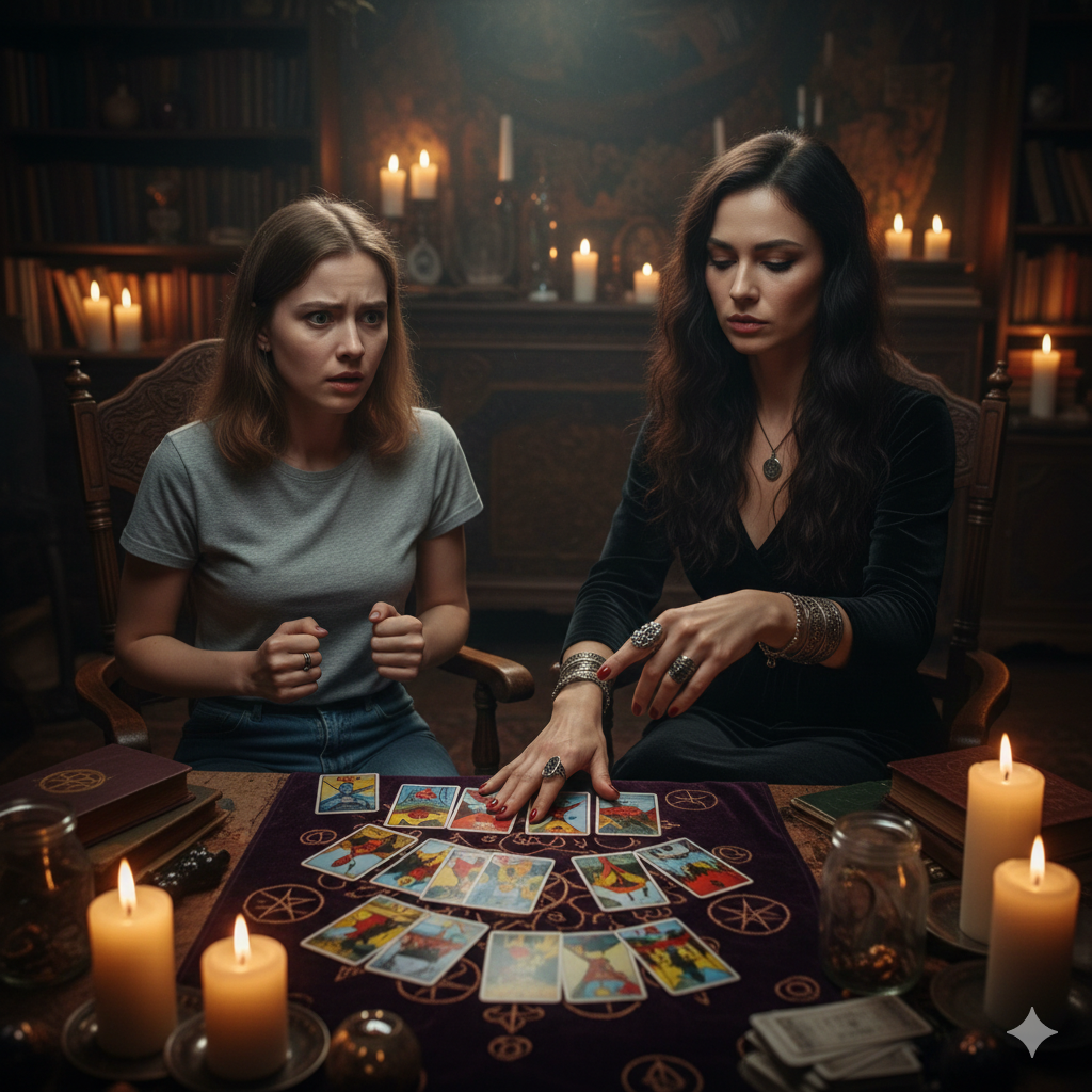 Полина открыла дверь и нетерпеливо пригласила подругу в маленькую комнату. Она обставила её книгами, свечами, разными атрибутами для создания соответствующей атмосферы. Здесь было прохладно, не смотря на зажжённые свечи. Посреди комнаты стоял стол, накрытый бархатной тёмной скатертью, на которой лежали карты таро.