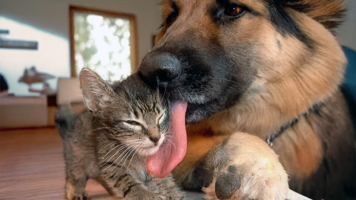 Кошечка, не обращая ни малейшего внимания на худую овчарку, рванула к миске с консервой. Собака с изумлением смотрела на малышку, потом обнюхала ту и принялась вылизывать…
