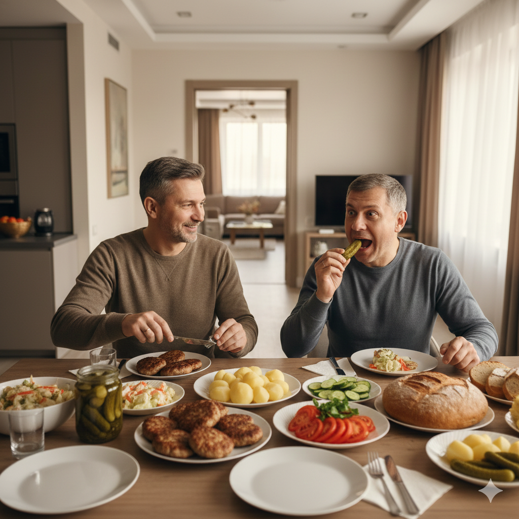 Пока гость переобувался и мыл руки, Витек уже метал на стол все, что было в холодильнике. Когда Серега зашел на кухню, на столе уже были котлеты, а на плите, в сковороде, разогревалась отварная картошка. Хозяин, между тем, ловко открывал домашние заготовки: огурчики, помидорчики, грибы, салаты.
