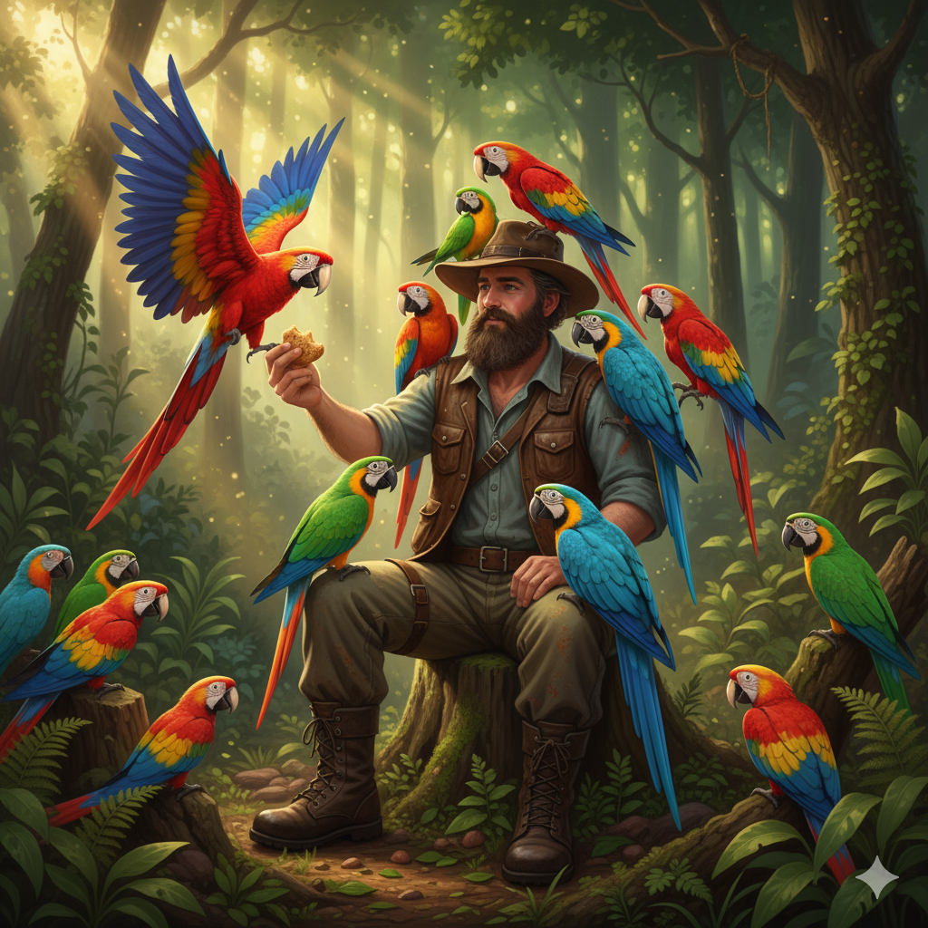 Оказывается, целая попугайская стая уже почти месяц наблюдала за Томом. И сейчас птицы сели на стол, землю вокруг и даже на плечи и голову Тома.