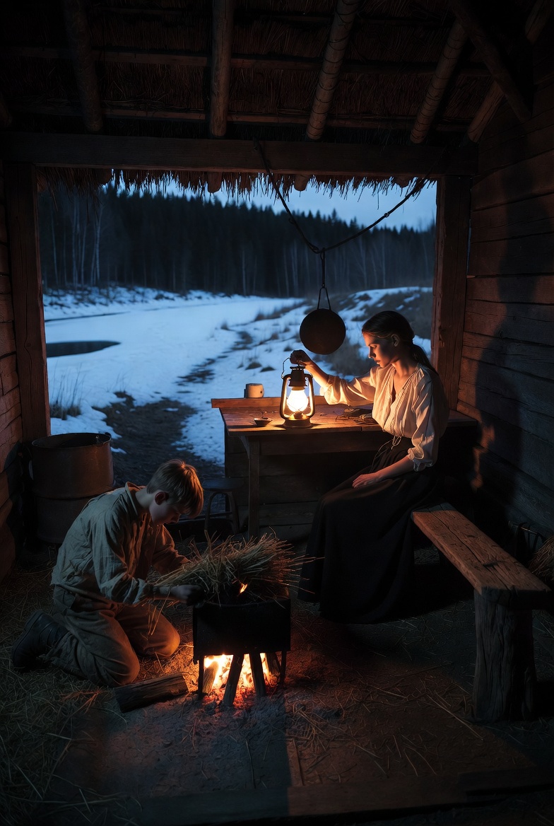 Она долго сидит на лавке у порога, словно и не хозяйка в этом доме. Потом медленно раздевается, уставшая и подавленная, и зажигает керосиновую лампу.