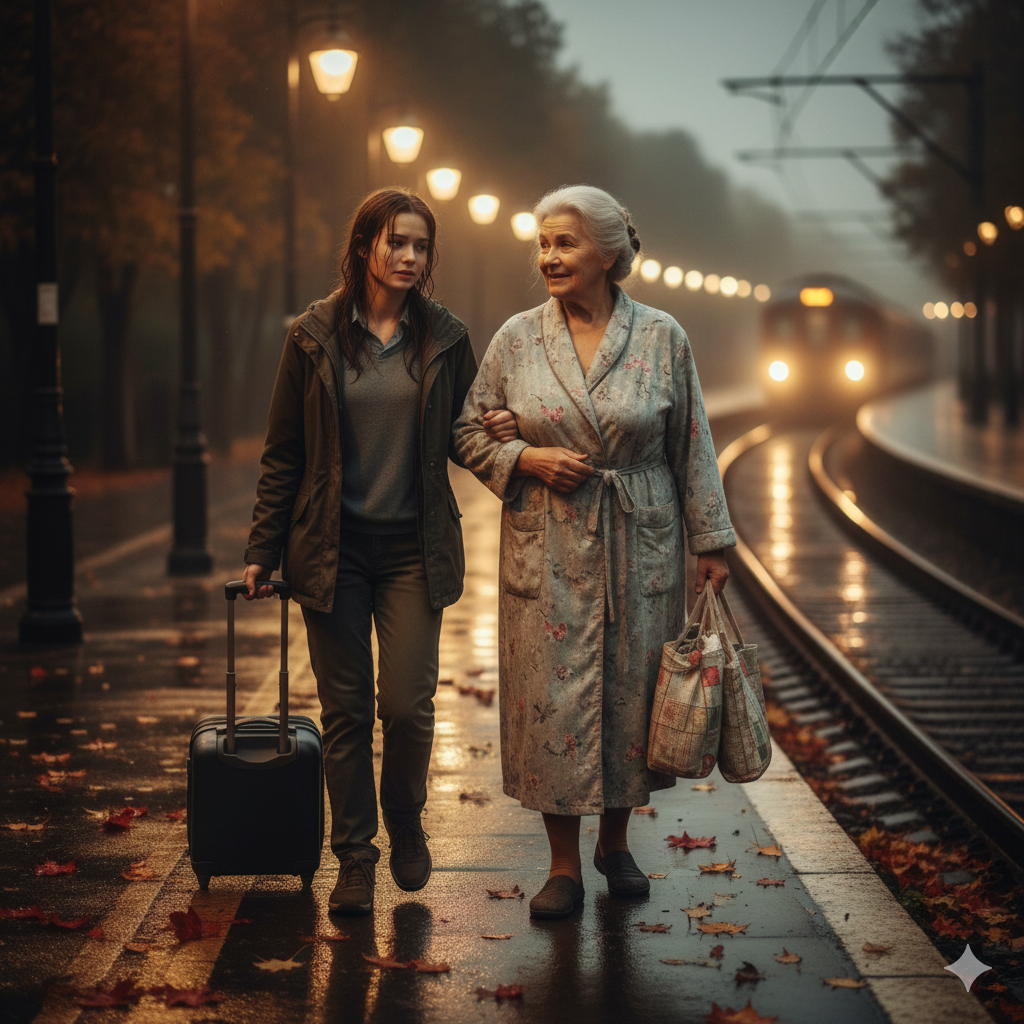 Поезд, грохоча скрылся за поворотом. Женщина и девушка с вещами идут по перрону.
