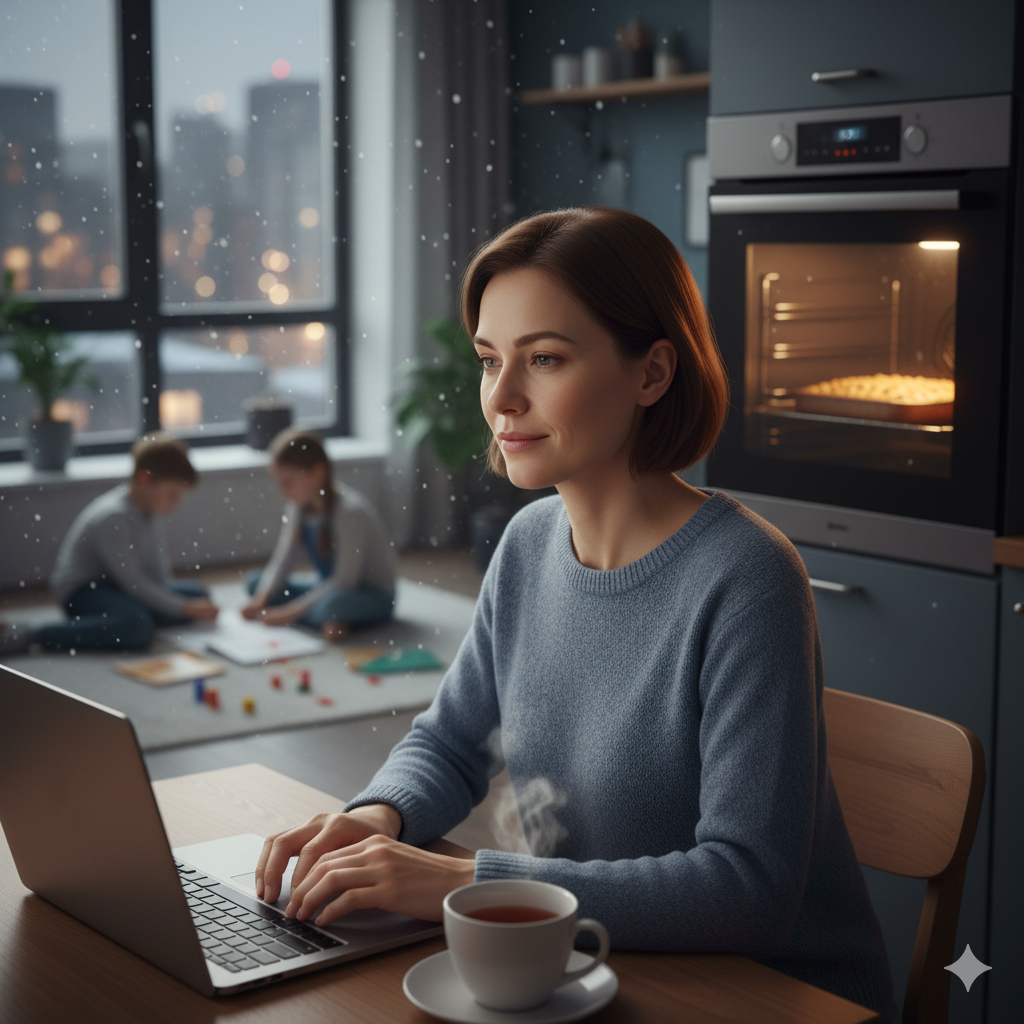 Прошёл год. Воскресным вечером Полина сидела в кресле с ноутбуком. Из комнаты доносились голоса детей: Даша помогала брату с английским. В духовке томилась любимая запеканка – теперь уже с грибами и курицей, по новому рецепту.