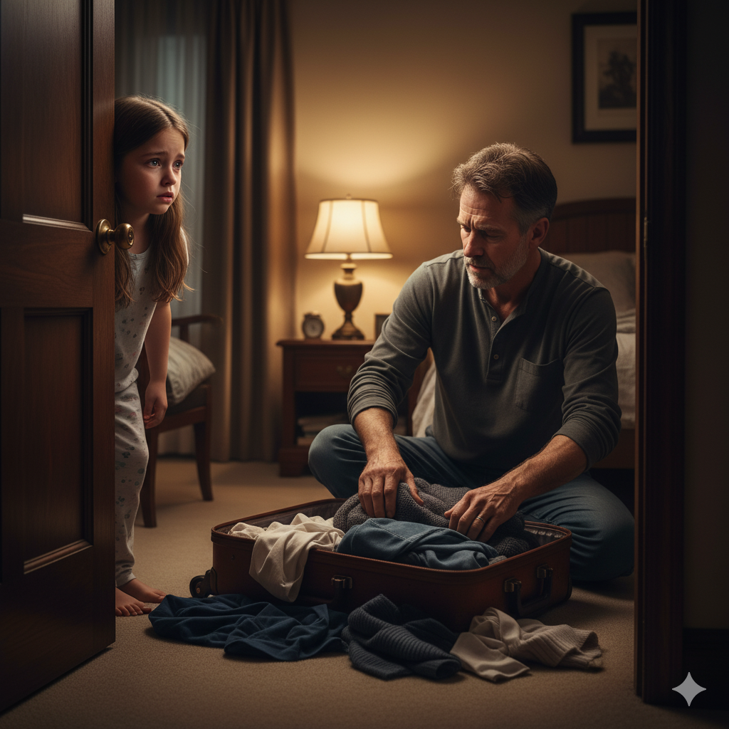Мужчина торопливо складывал вещи в раскрытый чемодан, изредка бросая взгляды на стоявшую в дверях комнату девочку.