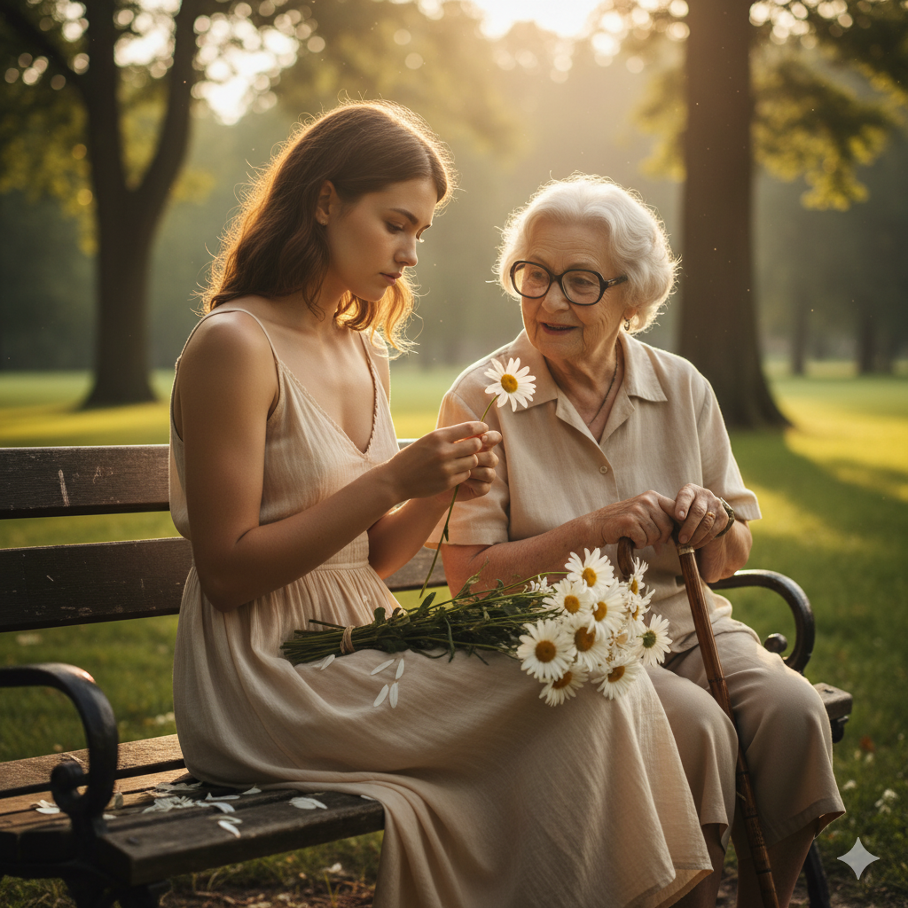 Она взяла из букета очередной цветок, и хотела начинать опять обрывать его лепестки, но тут на скамеечку подсела проходившая мимо бабушка — божий одуванчик. Пожилая женщина была немного подслеповатая, в огромных очках, и с палочкой в руках.