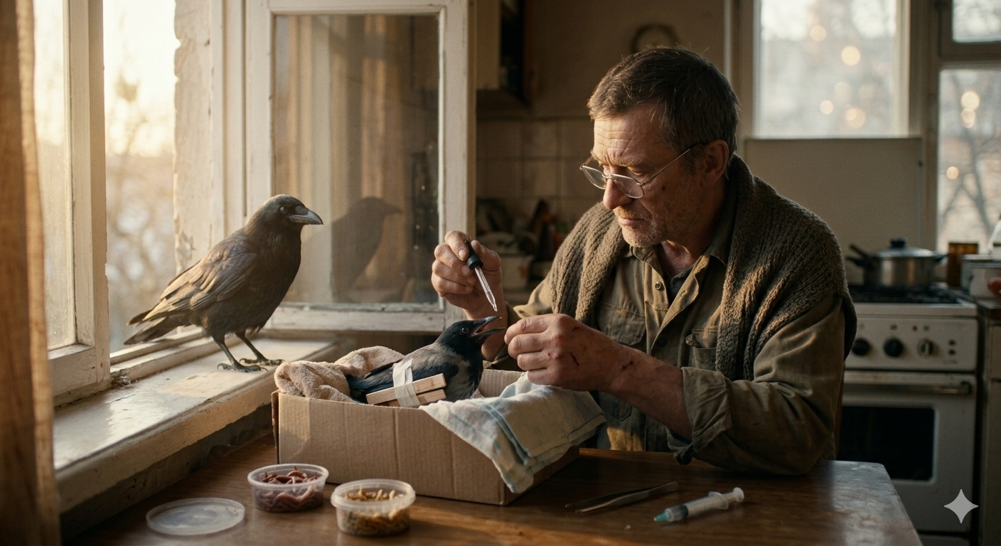 Ему приходилось насильно открывать ей клюв и заталкивать туда червяков и опарышей. Водичку он заливал шприцем.