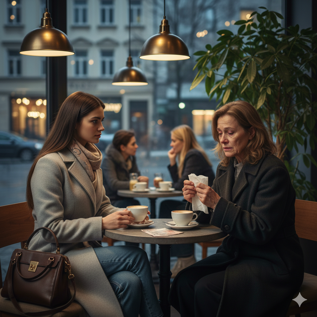 Когда официант поставил перед ними чашки и тихо отошёл, незнакомка наконец решилась заговорить. Она глубоко вздохнула, словно перед прыжком в холодную воду, и тихо произнесла: