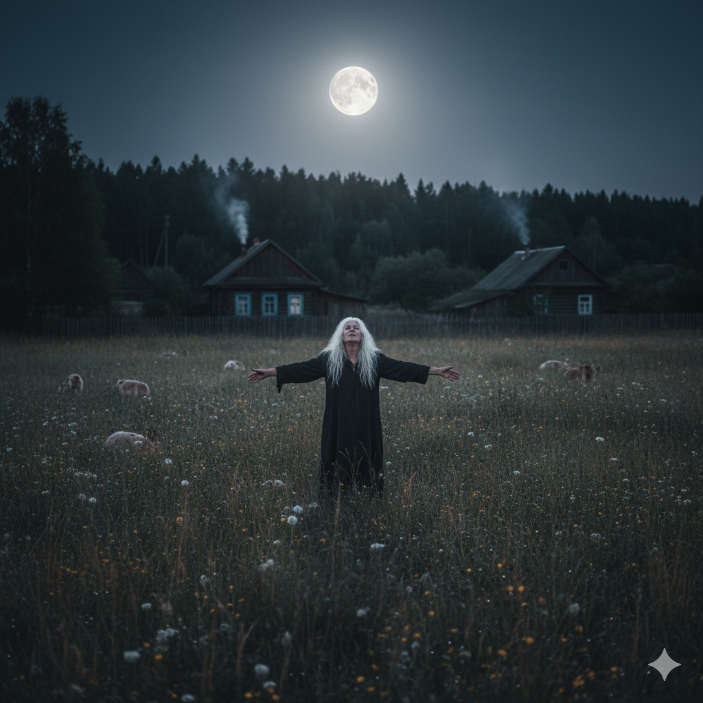 Там посреди поляны в лунном свете стояла женщина с протянутыми руками к небу и неподвижно смотрела на него. Женщина была погружена в себя, не замечала ничего вокруг, молчала. Потом опустив руки и поклонившись, она побрела по поляне в конец деревни.