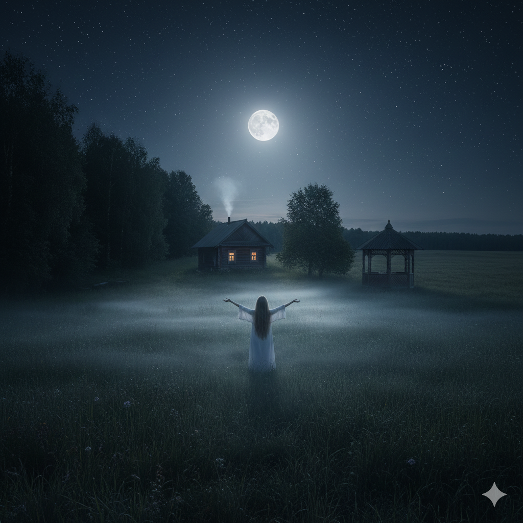 Там посреди поляны в лунном свете стояла женщина с протянутыми руками к небу и неподвижно смотрела на него. Женщина была погружена в себя, не замечала ничего вокруг, молчала. Потом опустив руки и поклонившись, она побрела по поляне в конец деревни.