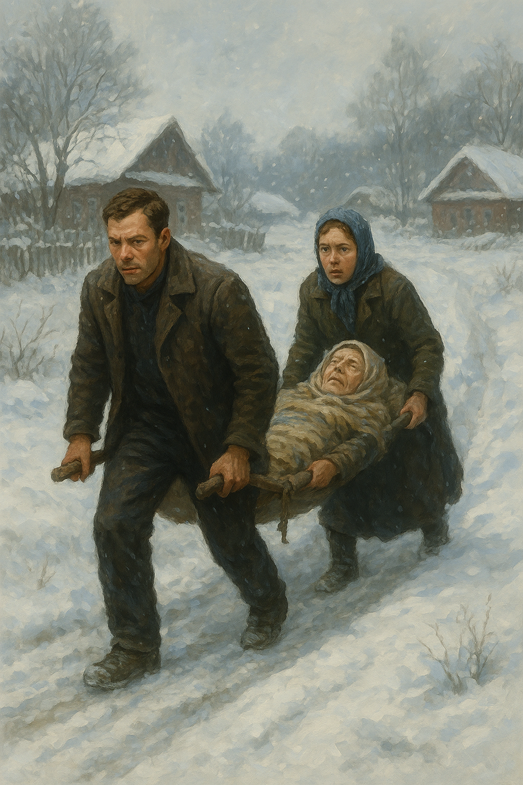 Григорий Ильич впрягся, Марина встала сбоку, присматривая за бабкой. Шли долго, но когда притащили Архиповну, тут и подъехала скорая. Пока тащили бабушку, марина с Григорием разговаривали.