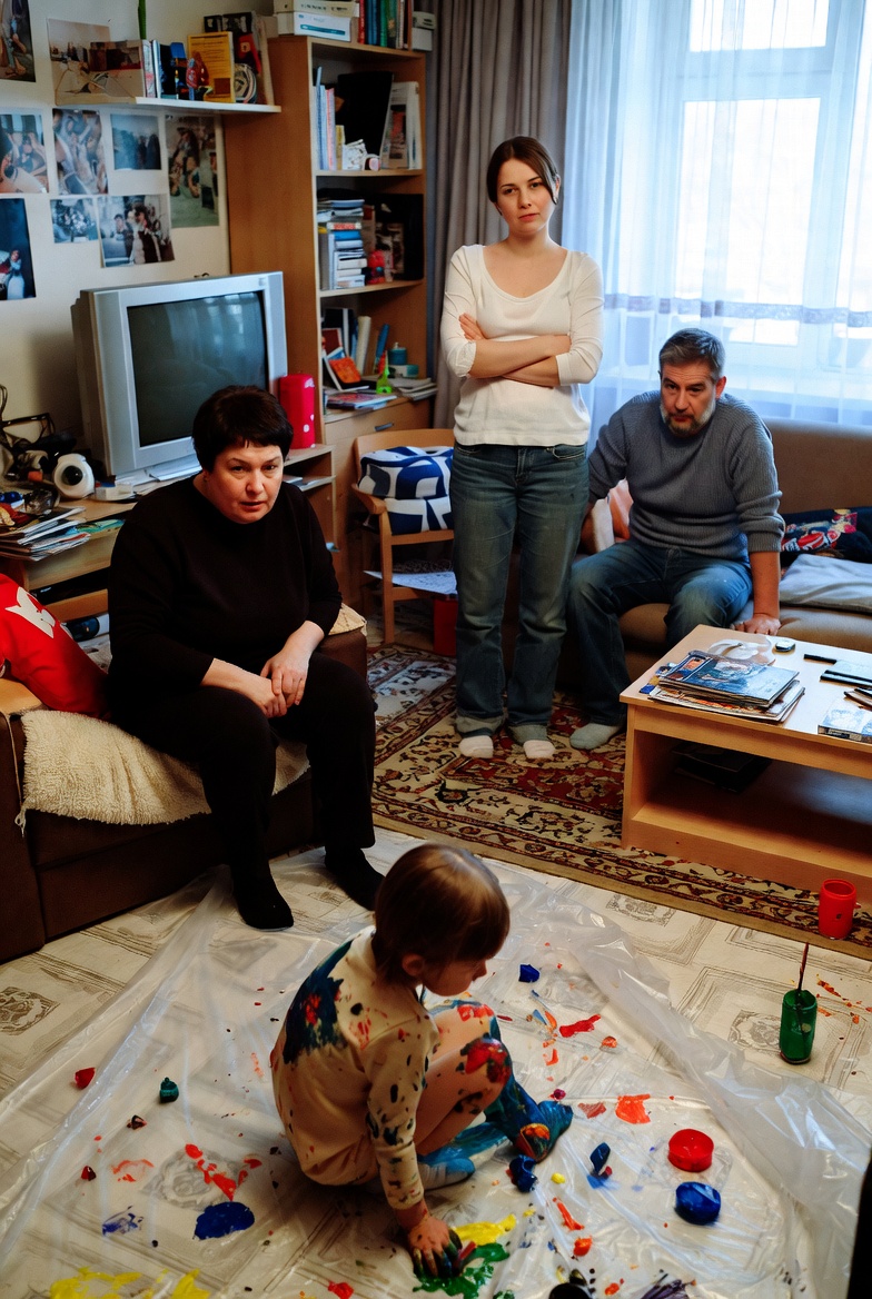 Когда же Арине было около года, разразился настоящий скандал. Марина, заглянув в детскую комнату, буквально остолбенела. Чуть ли не половина пола была застелена клеенкой, поверх которой лежал кусок непонятных обоев. И вот на этих обоях сидела улыбающаяся Арина, которая макала пальчики в баночки с гуашью и размазывала краски везде, куда могла достать: на бумагу, на клеёнку, на себя и даже на мамину ногу — Лена сидела рядом и совершенно спокойно взирала на это безобразие.