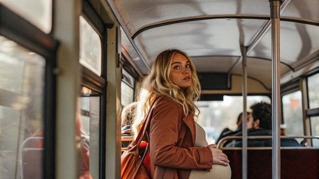 Когда подъехали к вокзалу, беременная женщина встала. Прошла к двери.