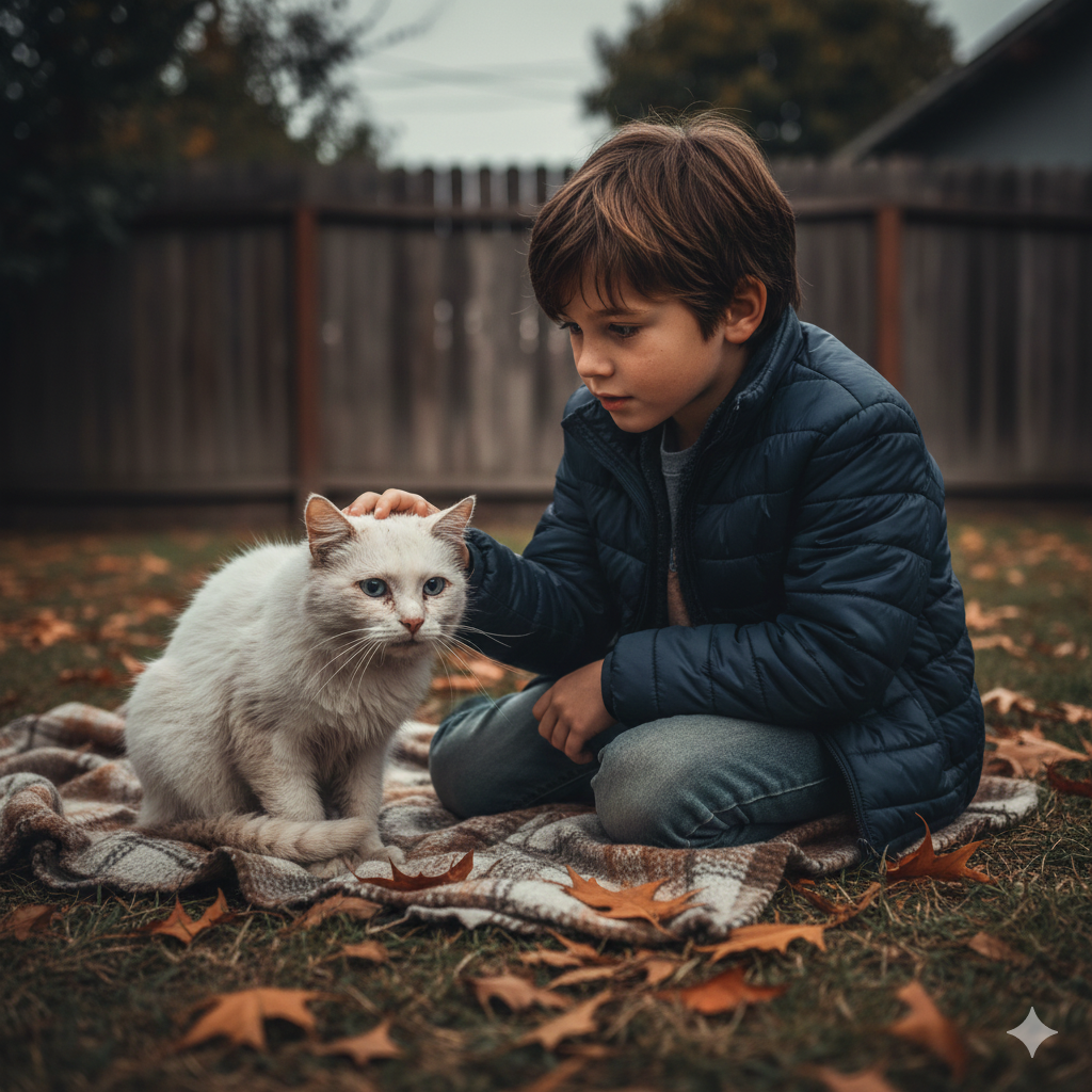 Мальчик направился к кошке, присел рядом и погладил её. Кошка беззвучно плакала. Она не просила, не мяукала и не мурлыкала. Она просто плакала и смотрела…