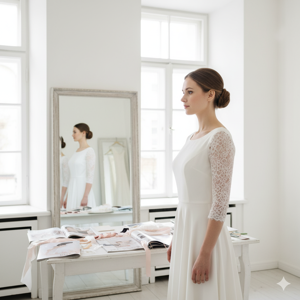 Василиса стояла перед зеркалом в примерочной, и в груди билось странное, непривычное чувство – не восторг, как она ожидала, а спокойная, почти деловая уверенность. Белое свадебное платье облегало фигуру, подчёркивая линию плеч и плавно расширяясь книзу. Лёгкие складки ткани шелестели при каждом движении, а кружево на рукавах ловило свет, создавая едва заметную игру теней.