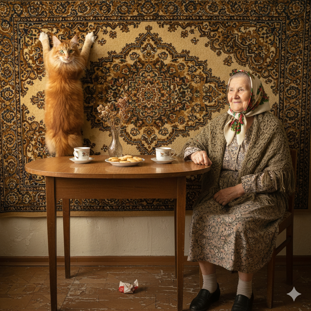 И правда, не выдержал. Смотрю, а позади старушки, из старой медной вазы медленно вылезают: сначала кисточки на ушах, затем и сами уши, и два зелёных глаза-фонаря. И на бабушкин фантик смотрят.