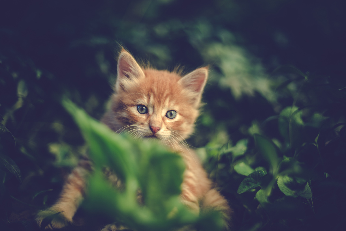 Котенок то появлялся среди зеленой травы, то пропадал на несколько секунд.