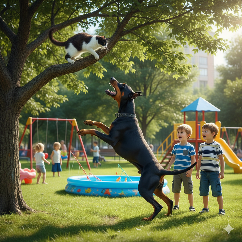 Чёрный доберман грозно рычал под деревом — кошек он не просто не любил, а дико ненавидел! Такие шустрые и хитрые, они раздражали его с самого детства.