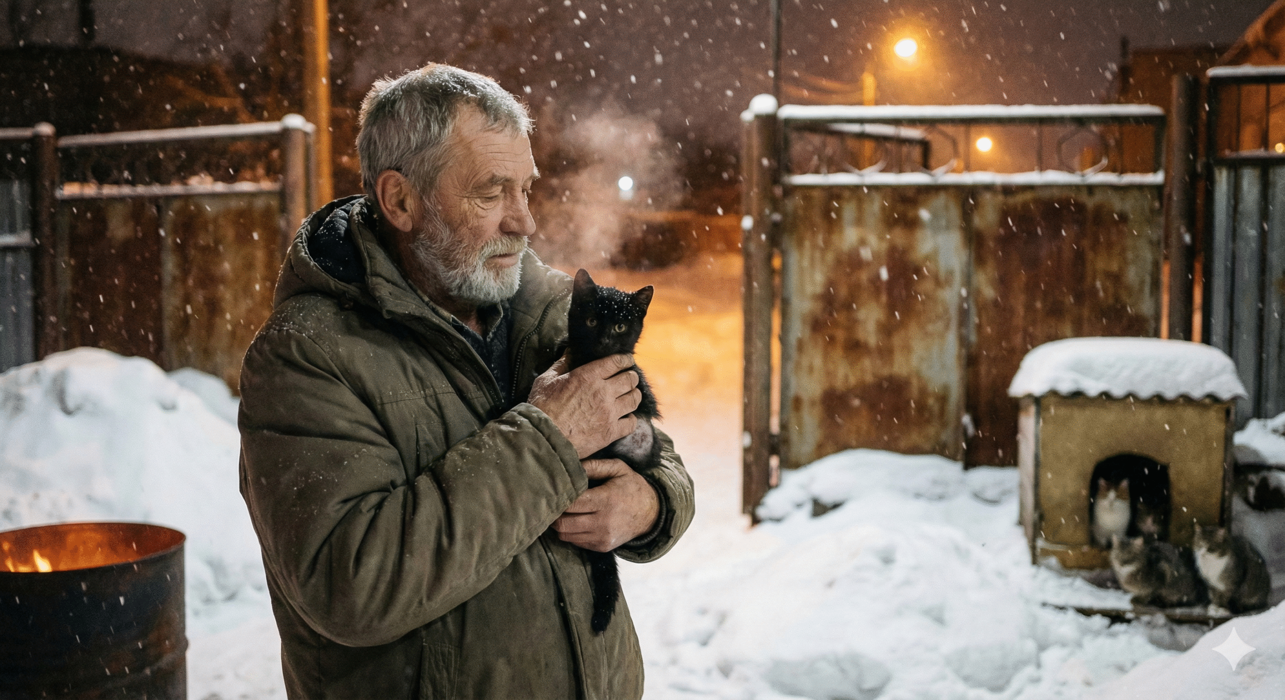 Михалыч тоже еле добрался до работы и, как все сотрудники, немного опоздал в этот день. Дворник уже расчистил дорожки, и коты выглядывали из будки в ожидании еды.