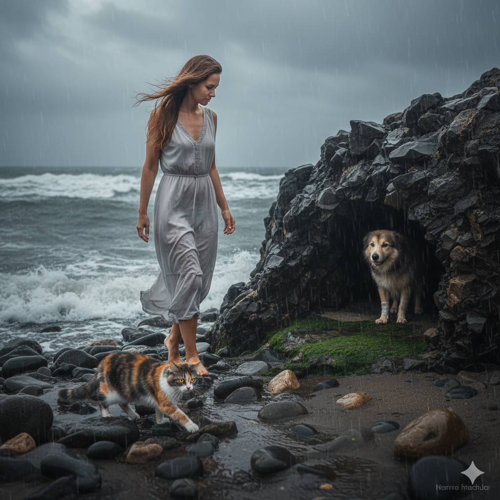 К вечеру они с новой пушистой знакомой пошли вдоль берега моря, к скалам. Море снова было неспокойное, небо хмурилось. Погода резко меняла настроение, дождь то и дело срывался частыми мелкими каплями.