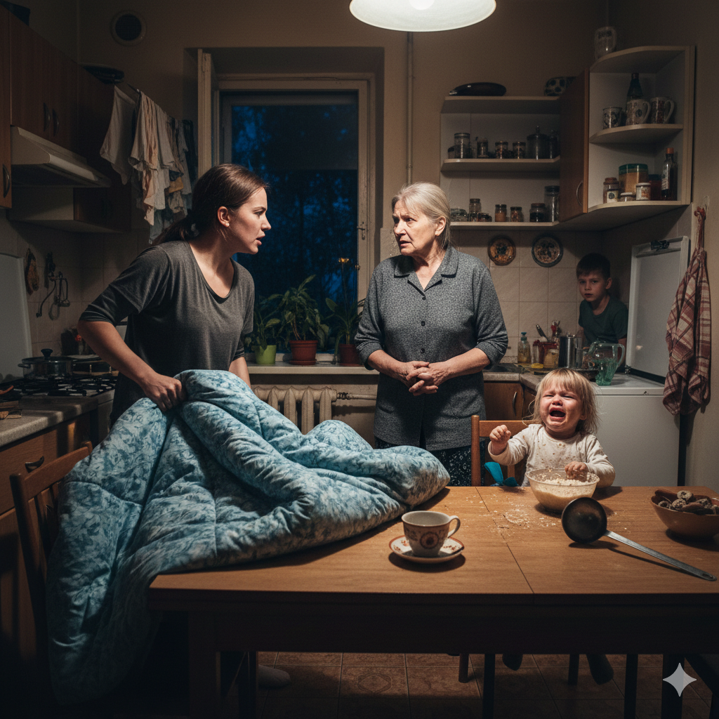 Свекровь осталась стоять посреди кухни. Синее одеяло лежало на столе как вещественное доказательство преступления, которого она не совершала.