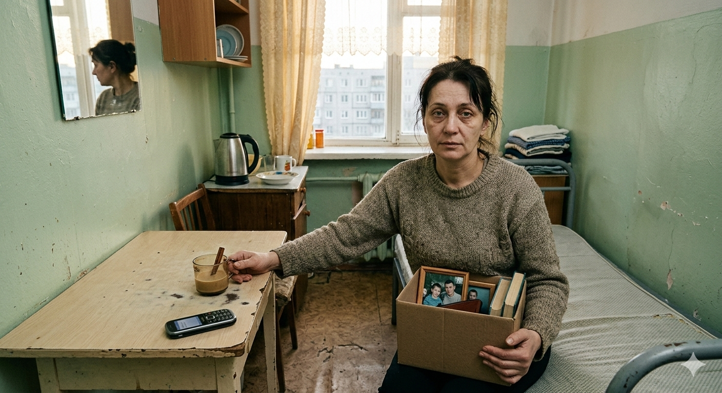 Сорок девять лет. Комната десять метров. Работа кассиром за двадцать две тысячи. Никакого дома, никакого имущества.