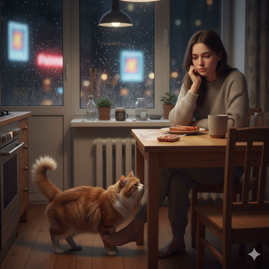 На улице темно, холодно, дождь еще начался, а она идет, потому что у неё кот страдает… Впрочем, сейчас она была на всё готова, лишь бы он её простил.