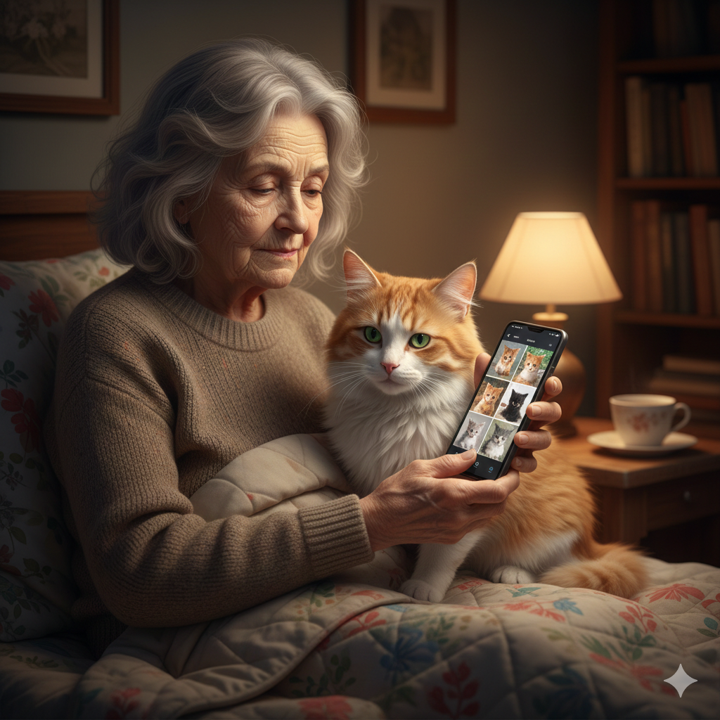 А вечерами они обычно сидят вдвоем на кровати и вместе смотрят на телефоне фотографии (в какой-то момент Тамара Васильевна стала снимать котят на камеру).