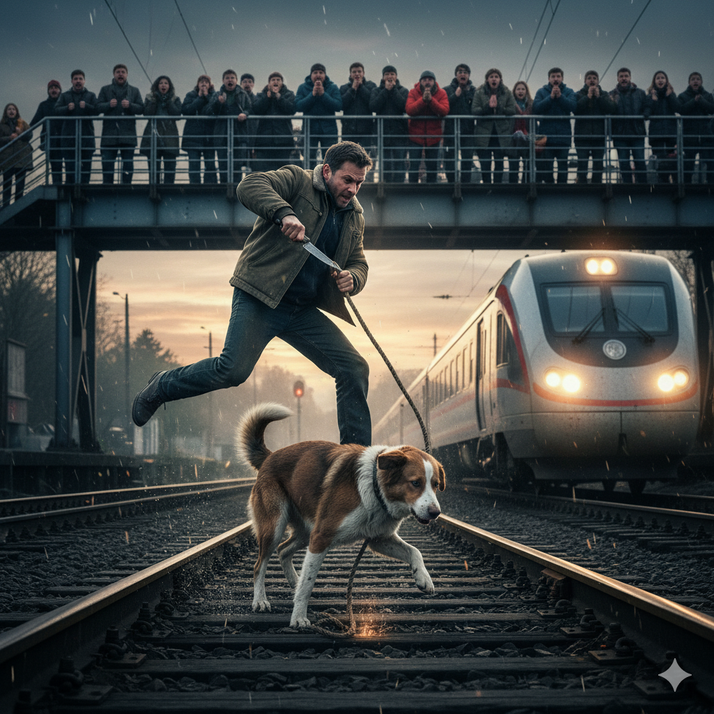 На путях, между рельсами, дергалась собака. Её лапа попала между шпалами, и она не могла вырваться. Через шум толпы до его слуха вдруг донеслось жалобное, обреченное подвывание…